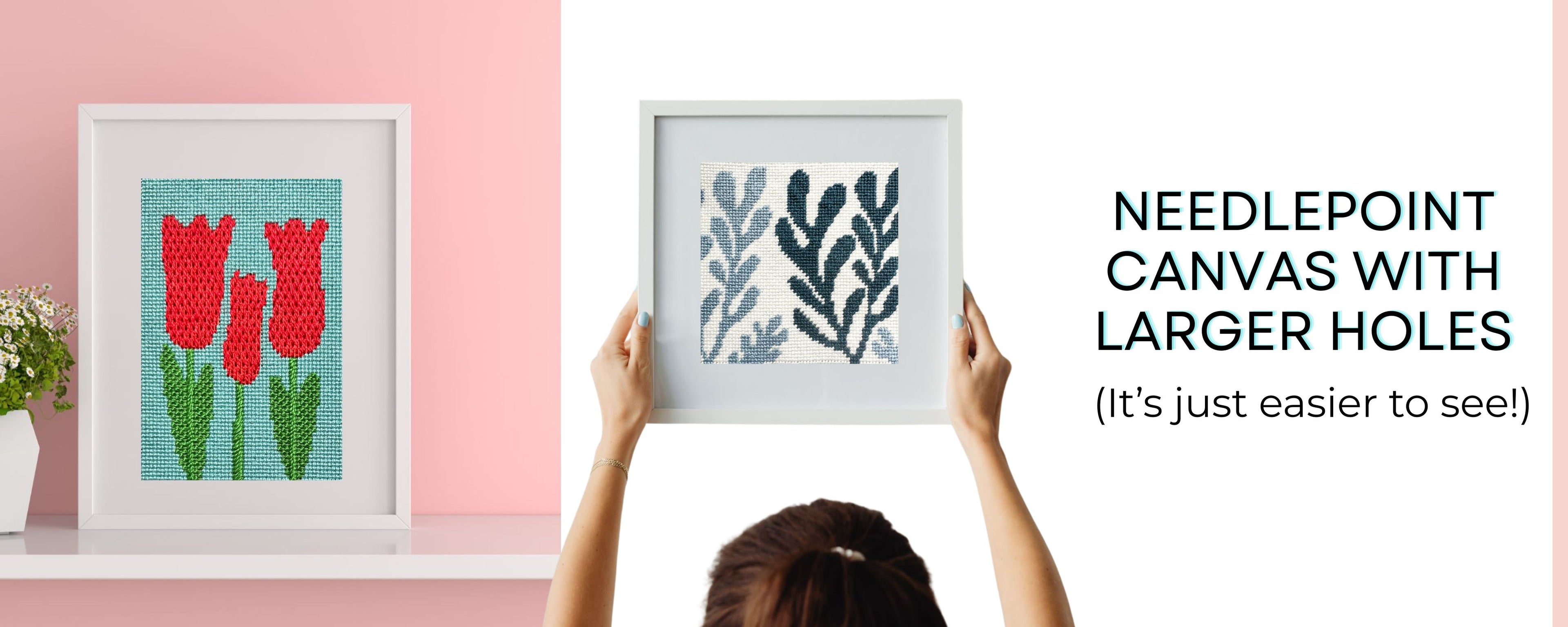 Prefer a slightly bigger stitch? Our large mesh needlepoint kits are printed on lower-count canvas (perfect for those who find traditional canvas too fine) and offer a more tactile and relaxed stitching experience. Ideal for aging eyes and beginners.