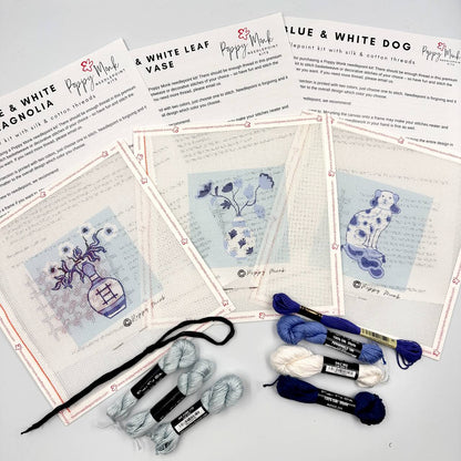 Three popular blue and white needlepoint designs that line up beautifully together.