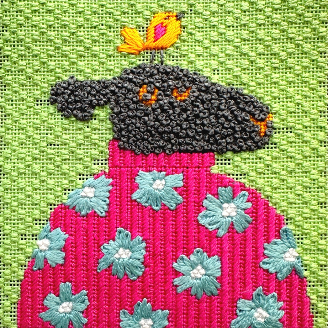 View GuideA helpful guide to the decorative stitches in the Simpatico in Pink canvas, showing where fun textures bring extra charm to the sheep, sweater, and little bird. Awesome for adding character to your stitching designs.