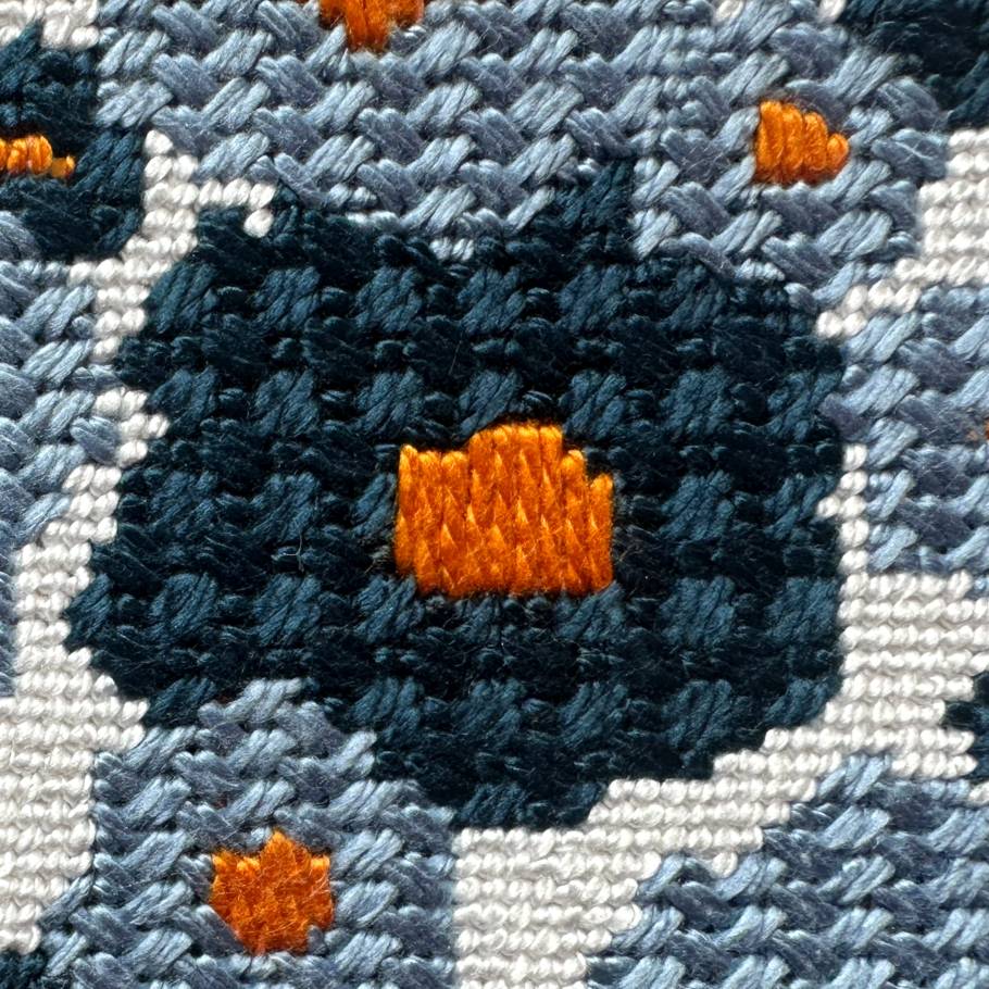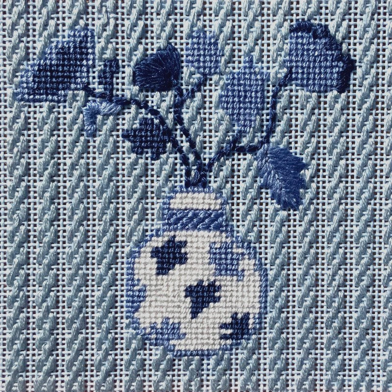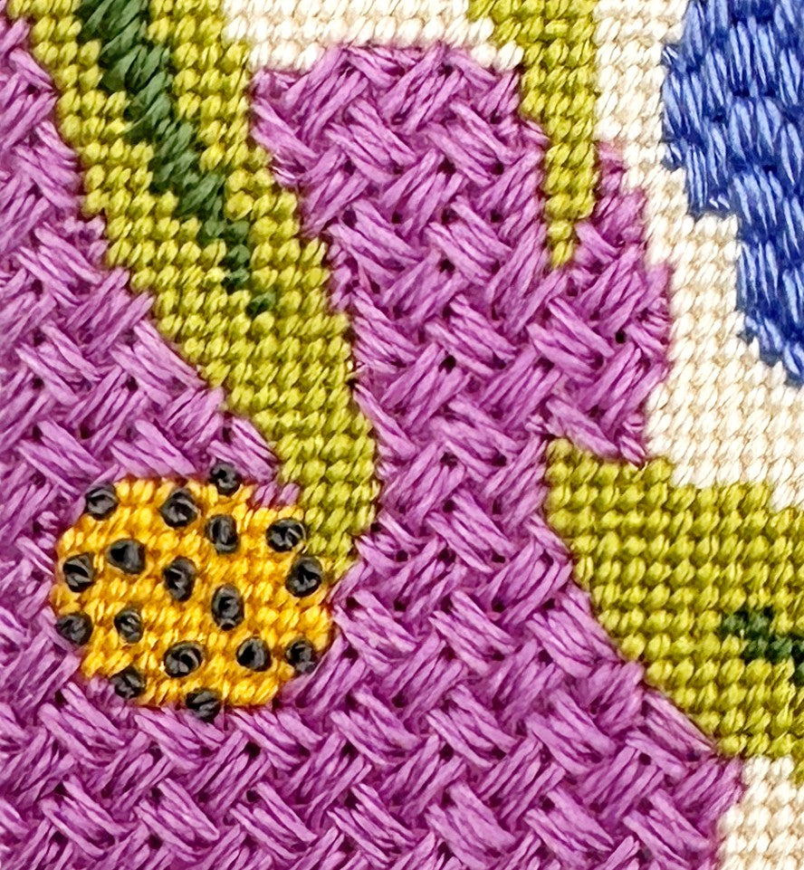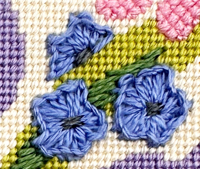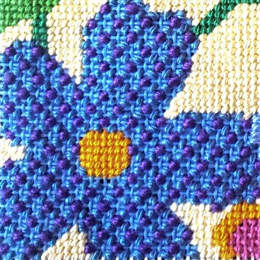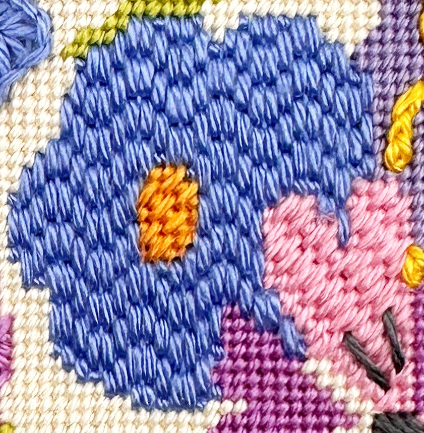 The darker blue flowers are stitched in Criss-Cross Hungarian stitch which is a heavily textured needlepoint stitch that does not show a direction so it's handy for overall patterns.