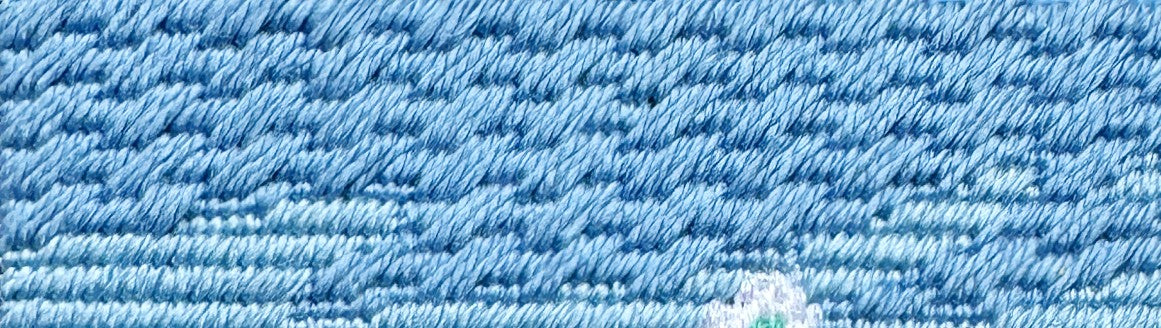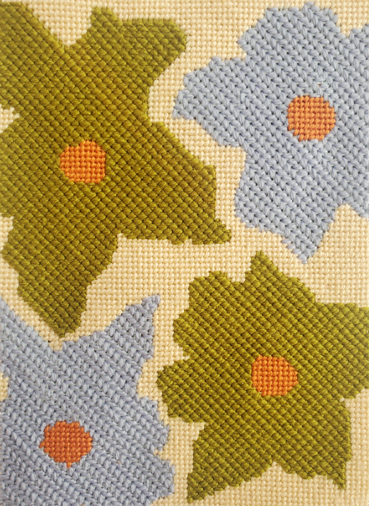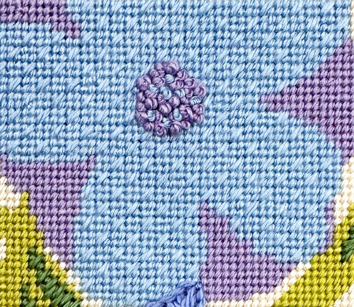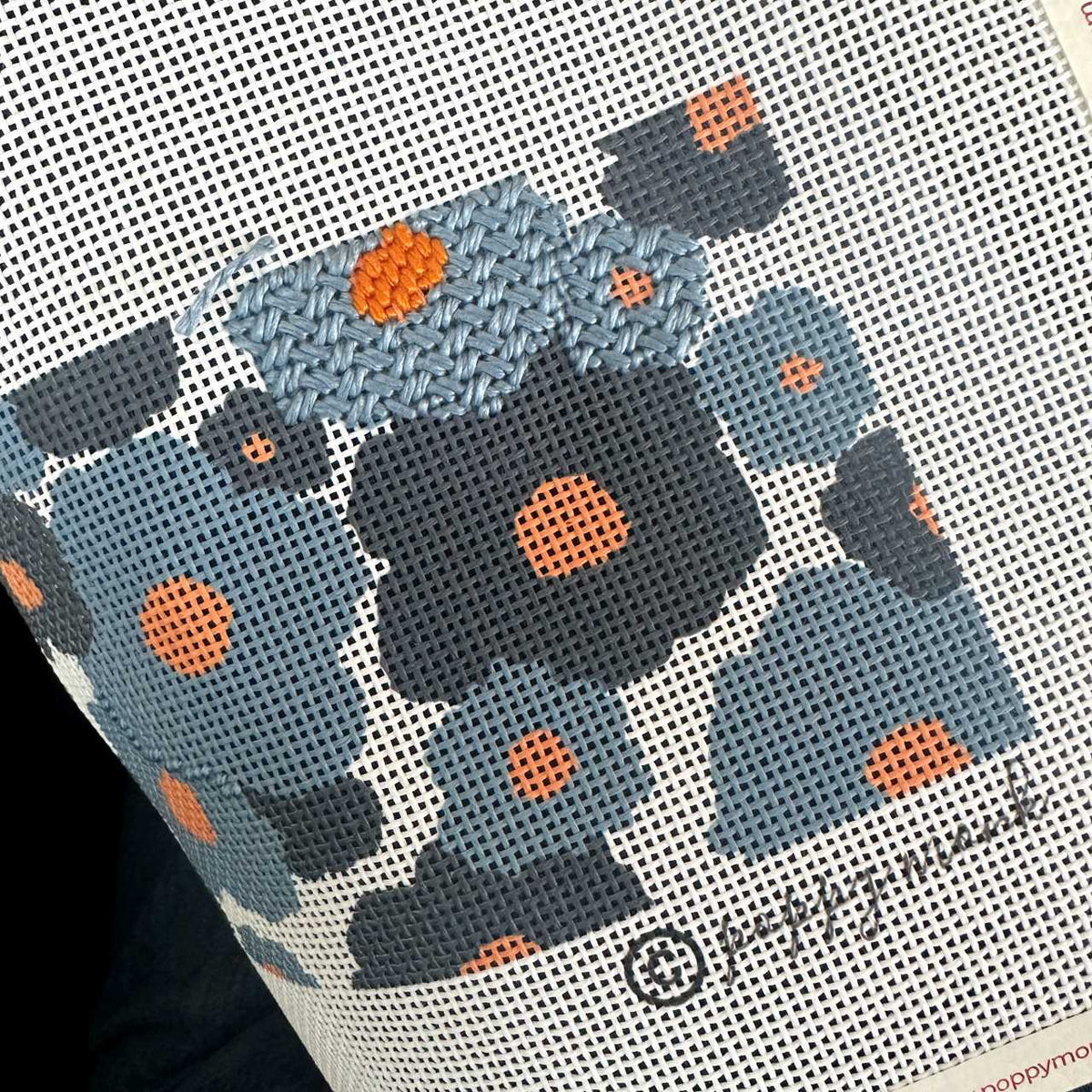 The darker blue flowers are stitched in Criss-Cross Hungarian stitch which is a heavily textured needlepoint stitch that does not show a direction so it's handy for overall patterns.