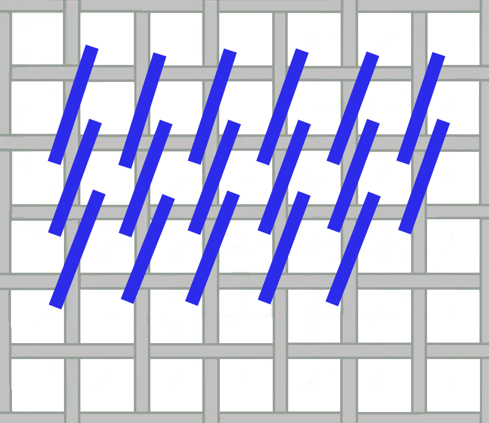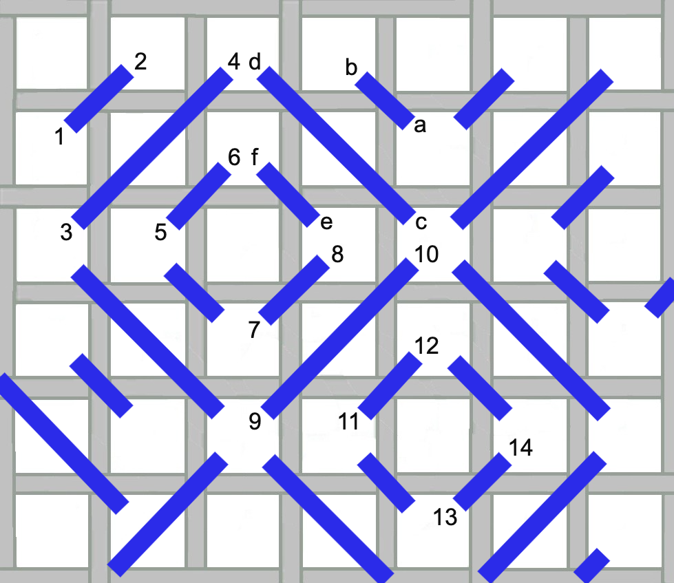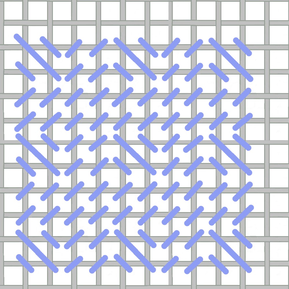 Work this in horizontal rows back and forth. It uses three parallel stitches over 4 intersections in alternating directions. Use your needle to move the overlying thread aside and find the hole that lies slightly beneath e.g. at holes 8, 10, and 12. Compensate as you go with partial stitches as needed.