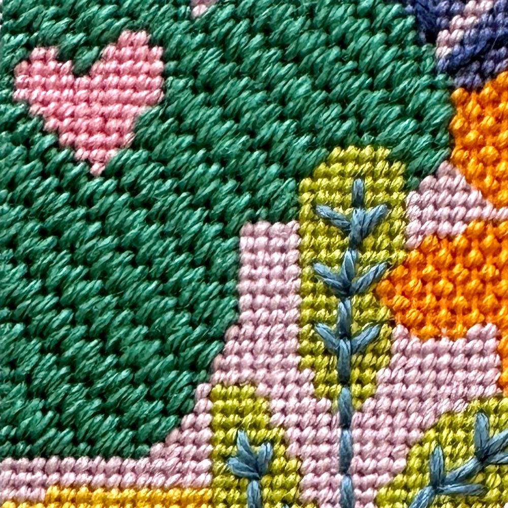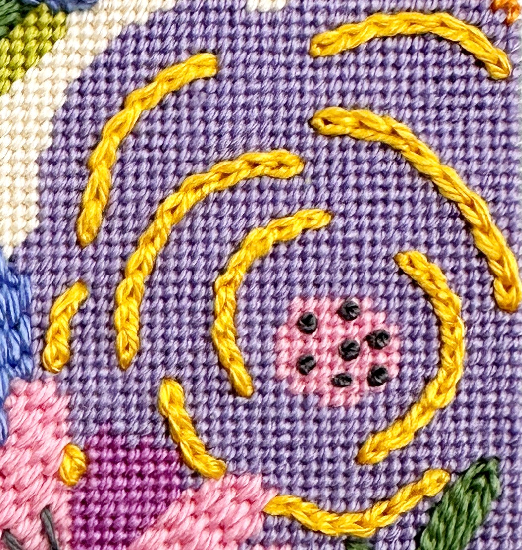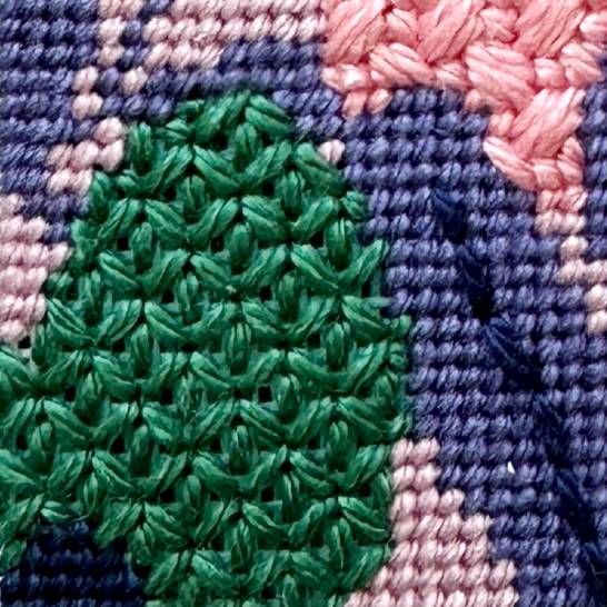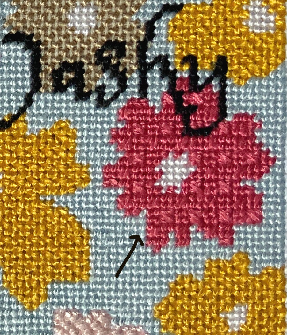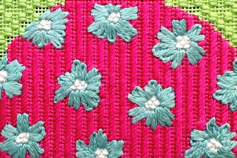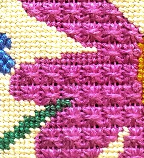 The pink flowers are stitched in Cobblestone stitch which is a lightly textured needlepoint stitch for small spaces