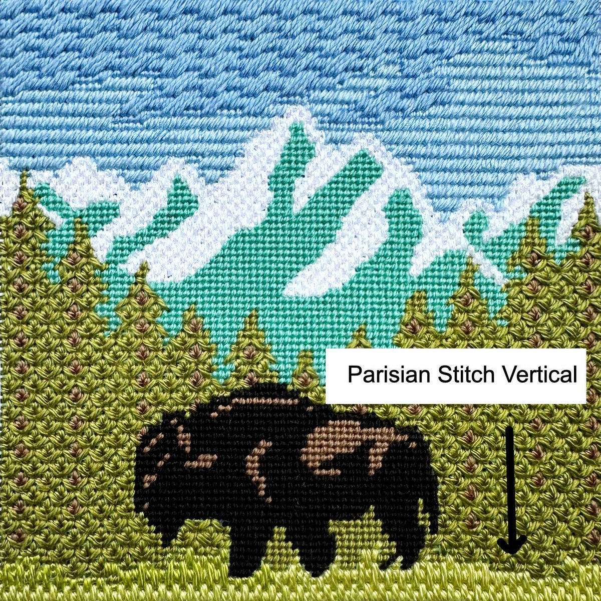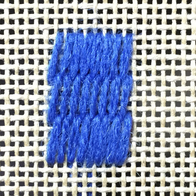 A traditional Parisian stitch goes long-short-long-short across a row. In this variation we have put all the long stitches in the same row and all the short stitches in the same row. The Parisian stitch, and this variation, are versatile needlepoint stitches that are staples for any stitch library because they fit almost anywhere.