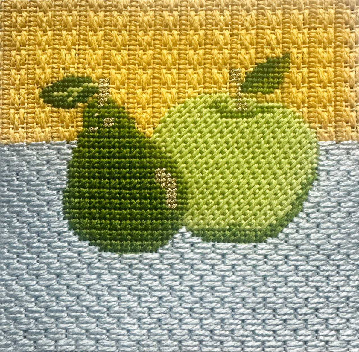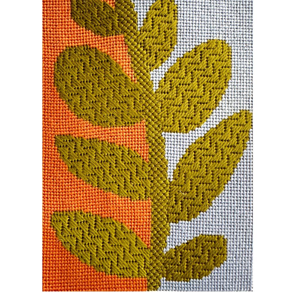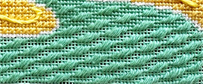 The yellow flowers are stitched in Alternating Tent which is a great little needlepoint stitch for small and large areas. It forms a diamond pattern which looks like a carpet! Follow the stitch diagram to get the best result.