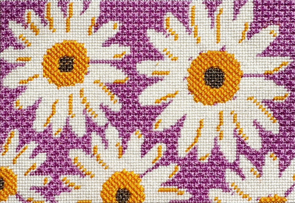 The background of this Daisies design is stitched in Alternating Mosaic. It forms a diamond-shaped pattern and fits in small to large areas.
