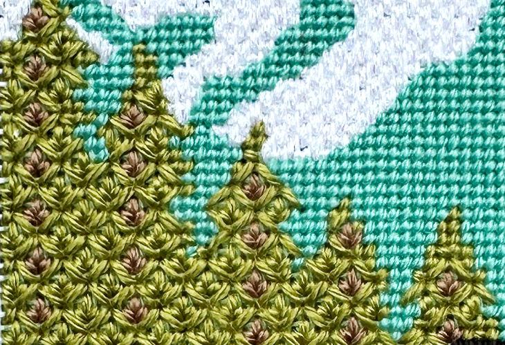 This is such a great stitch for trees and shrubs. It is worked in two parts: stitch the outer diamonds first (the darker blue on the chart below). There is no perfect way to stitch these. You can stitch rows of zig-zag, or even long diagonal lines. Choose a method and stick with it as much as you can. Then fill in with the internal "arrows", working the center stem and then the wings. The arrows can be the same color as the outer diamonds, or we have used a contrasting color in this model in some of the filler stitches, to show tree trunks. So many options! This would also be a great stitch for a variegated thread.