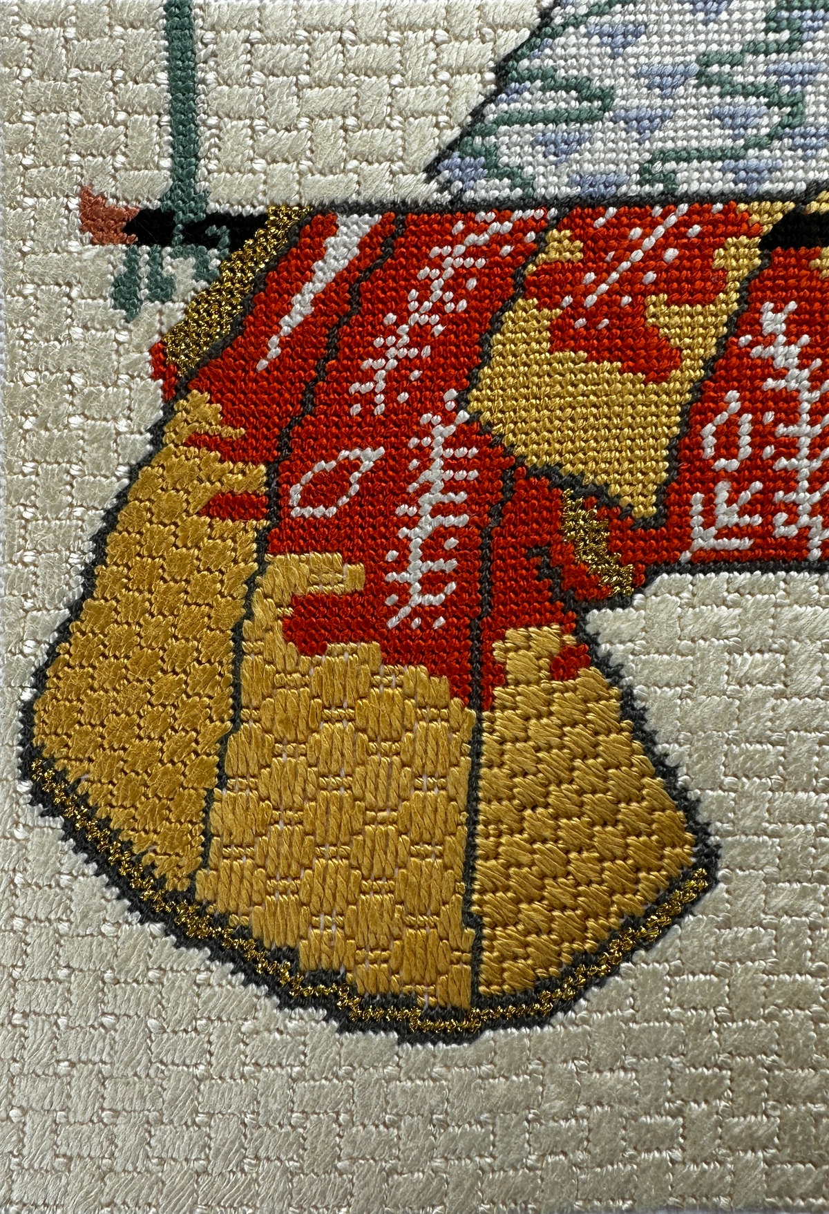 The stitch on the table is Serendipity and it makes a lovely basketweave/woven-style pattern. it is a non-directional stitch so a great choice for backgrounds and small-medium size areas that don't "move".