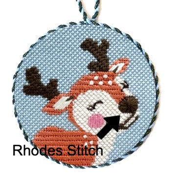 The Mosaic Needlepoint Stitch is used on the reindeer antlers in this design. It is a great background or filler stitch when you want a flowing pattern to add texture. It works well for hills, clothing, and many filler spots.