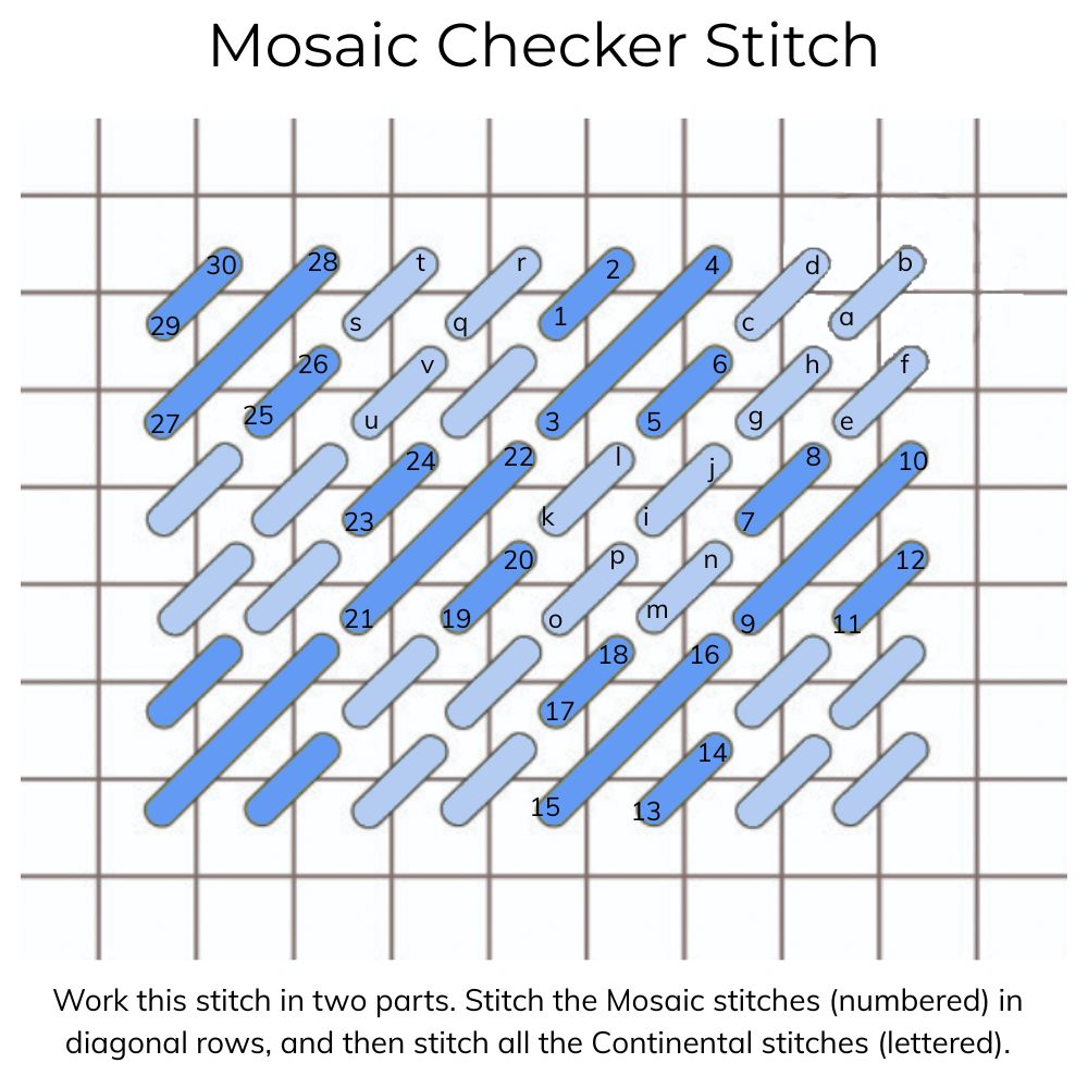 This stitch is best worked in two parts—stitch all the Mosaic stitches going in one direction (the numbers on the chart), and then stitch all the "alternating" stitches (the letters on the chart). Alternatively, you can stitch it in rows, alternating the stitch directions as you go.